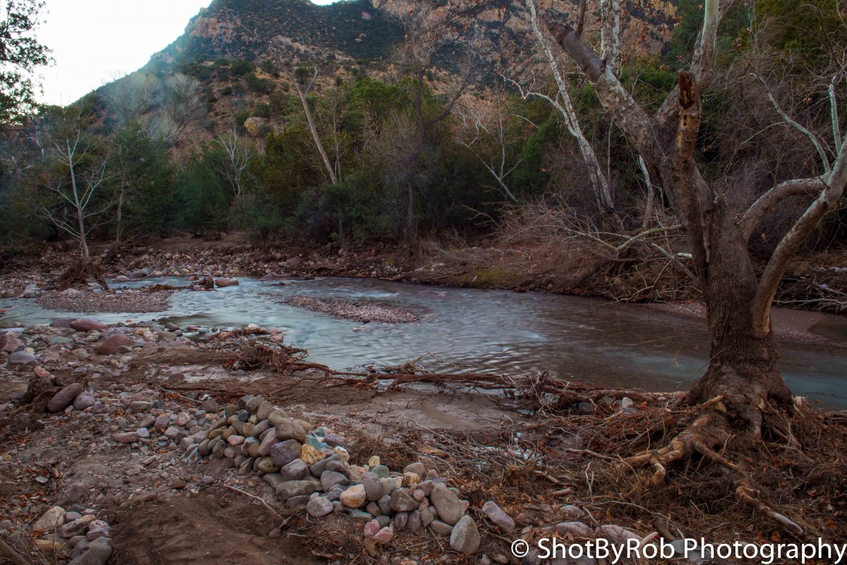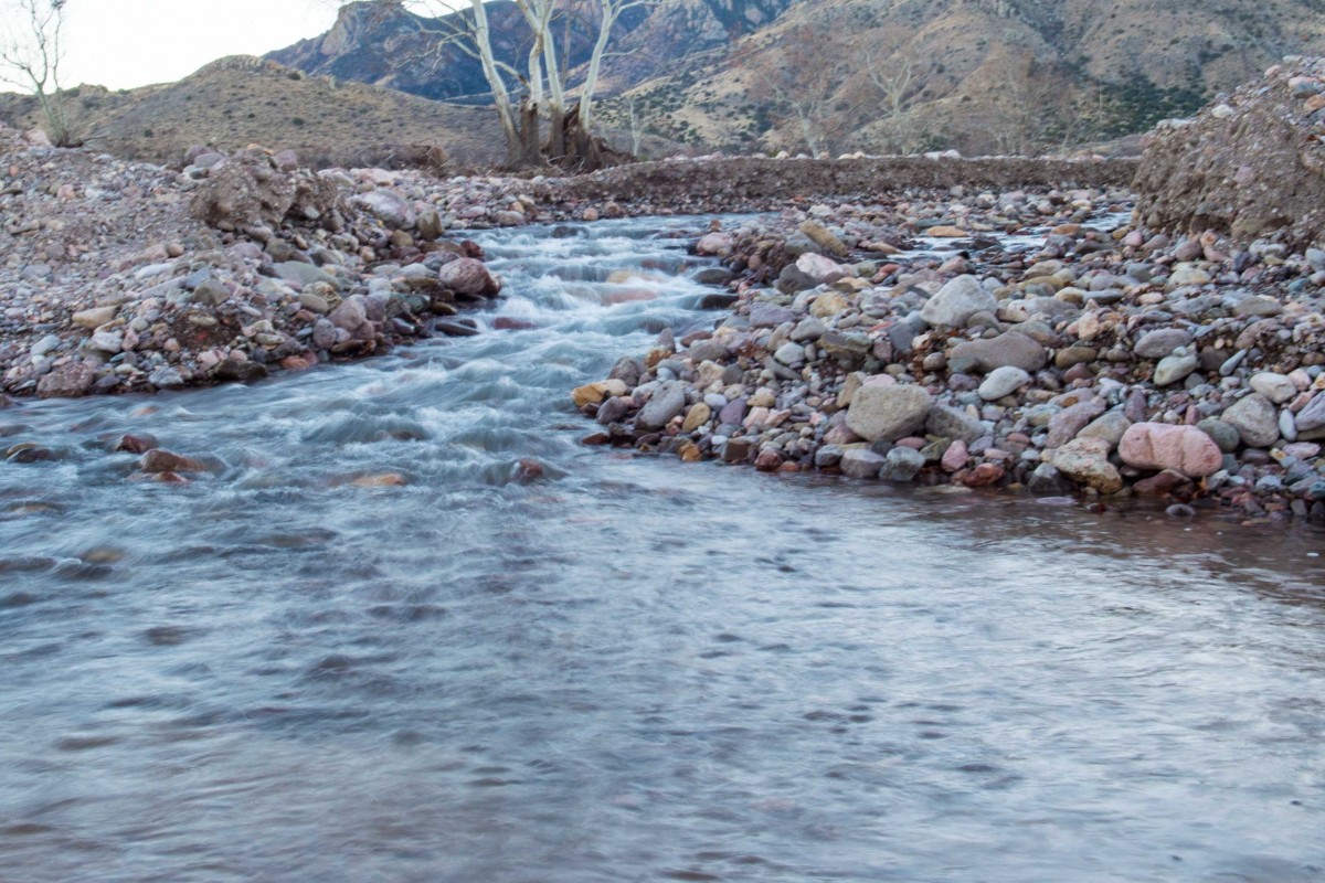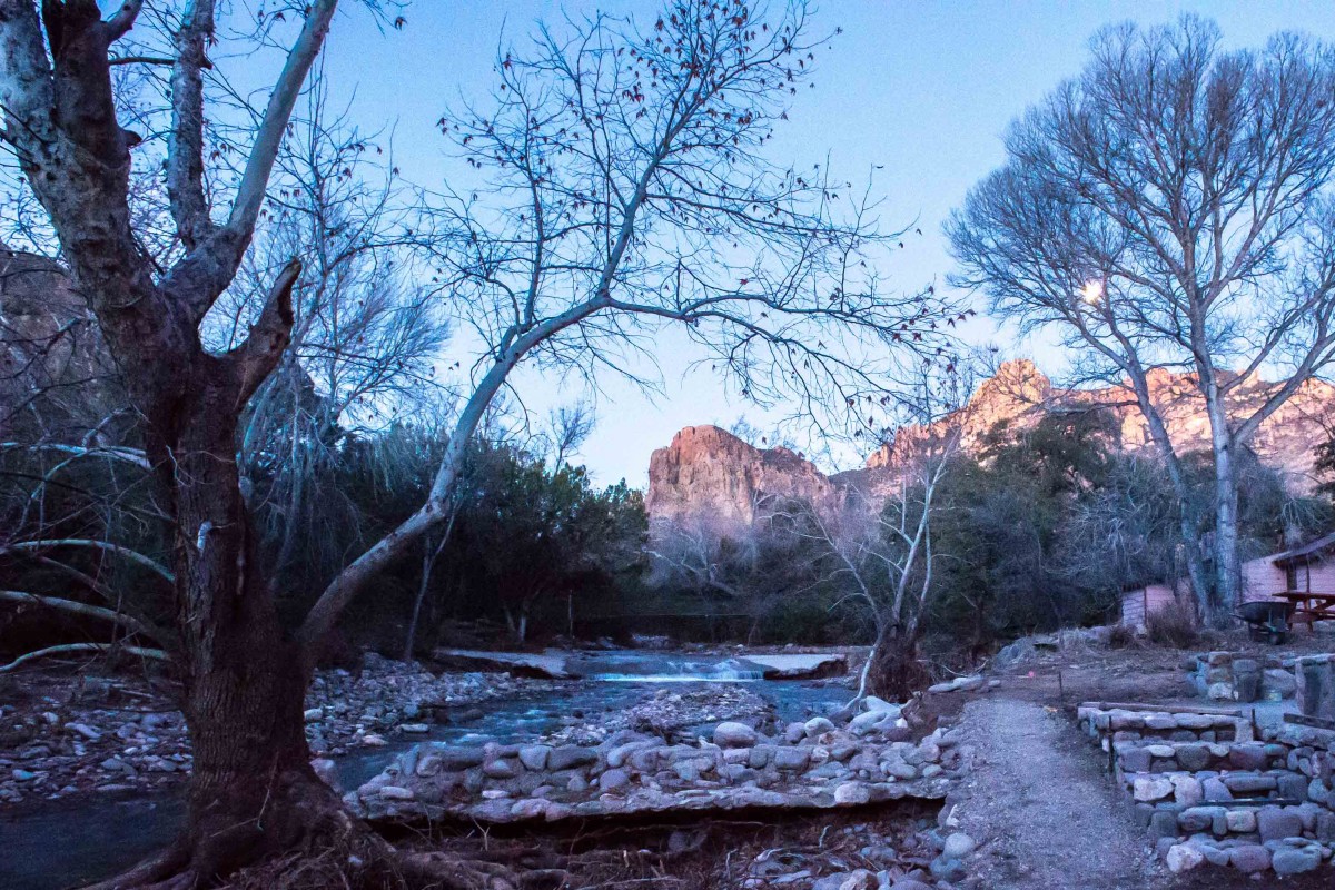 Perched right on the banks of Cave Creek, the ranch is a beautiful oasis set amongst the sycamore trees and juniper bushes. The crystal clear water of Cave Creek burbles an inviting tune as it cascades over the well rounded granite rocks and waterfall that the creekside cabin balconies overlook. The well appointed units have recently been renovated in a rustic “exposed rock and timber” feel, featuring tiled floors. Timber furniture completes the décor. Fully equipped and self contained, you only need to bring your food. This is essential because of the “outback” nature of the location. There are no regular local eating houses for approx. 40kms although on specific nights of the week the local Portal café (come general store ) does do dinner. There are two ways to get to Cave Creek Ranch. When you take exit 382 off the I-10 ( coming from San Simon) and turn onto the Portal road you have a 15km stretch of black top followed by a 24km unsealed ( but regularly graded ) road ahead of you. This winter the creek was running strongly after some unusually unseasonal rains, and we were forced to negotiate through a water crossing on the road. The other way to get to Cave Creek is via US80, which is sealed road all the way into Portal and Cave Creek Ranch.