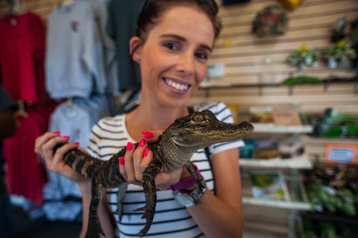 The Everglades basically have two seasons. HMM time (hot, muggy and mosquitos) May to October and BMM ( busy, mild and mammals ) November to April. It is busier in the winter as its a much more palatable time of year for non-Floridians. It is advisable in the winter to book ahead to do almost anything ( particularly if it has to do with alligators). There are at least a dozen airboat operators on the main road from Miami into the Everglades, we happened to choose “Capt’n Mitch’s” airboat tour and had an awesome time. Once aboard the airboat with its huge fan behind us, our driver cranked up the fan and we smoothly cruised away from the dock. It wasn’t long before we were alternating between scooting around the sawgrass swamps under the mangrove forest tunnels with the wind in our hair to sneakily slinking up on unsuspecting alligators and turtles basking in the sunshine. As we whizzed through the waterways it was fun to watch the many different birds like herons, mallards, woodstalks and roseatte spoonbills as they flew out from the shores of the waterways as we passed by at speed. There was an abundant variety of birdlife and plenty of alligators to be seen close up. Our trip was only one hour long which in hindsight wasnt really long enough for the amount of things there were to see. Back at the dock, and a vist to the ever present gift shop offered us the opportunity to hold an alligator, which was both exciting and concerning.