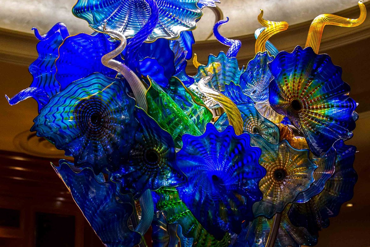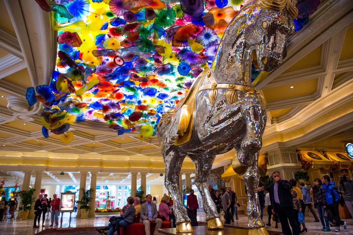 A few blocks north on Las Vegas Blvd the beautiful sprawling Bellagio complex bids you welcome from across its large 8-acre street front lake, its signature feature attraction a dancing fountain that bursts forth with thick jet streams of cascading water every half hour. Spanning the entire width of the lake, the water gyrates to music all the while shooting hundreds of narrow spouts of water high into the air, bending and flowing with smooth fluidity like a well rehearsed ballerina. Add coloured lights and the daytime show is transformed into an evening spectacular. Inside, the Bellagio is equally jaw dropping. Greeted by a doubly oversized mirrored glass and gold plated stallion in the middle of the foyer, poised underneath a recessed oval ceiling of multi-coloured pieces of blown glass, the entry to hotel screams opulence. Travelling with four adult family members, we splurged a little and rented a modest penthouse suite. ( Not one of the big ones like in Hangover the Movie) What we didn’t know was that when you book a certain type of upscale room, you get some extra benefits. Like, for example, being whisked away upon arrival to a special personalized check-in suite, complete with bar, buffet and plush chairs to rest your weary travellers bones in whilst an attentive staff member arranges all the administration of your arrival. Someone magically spirits your baggage away, and you’re ushered politely to a secret bank of elevators that only service the penthouse floors. Secret hallways and elevators behind timber panelled walls. It was like living a James Bond movie!