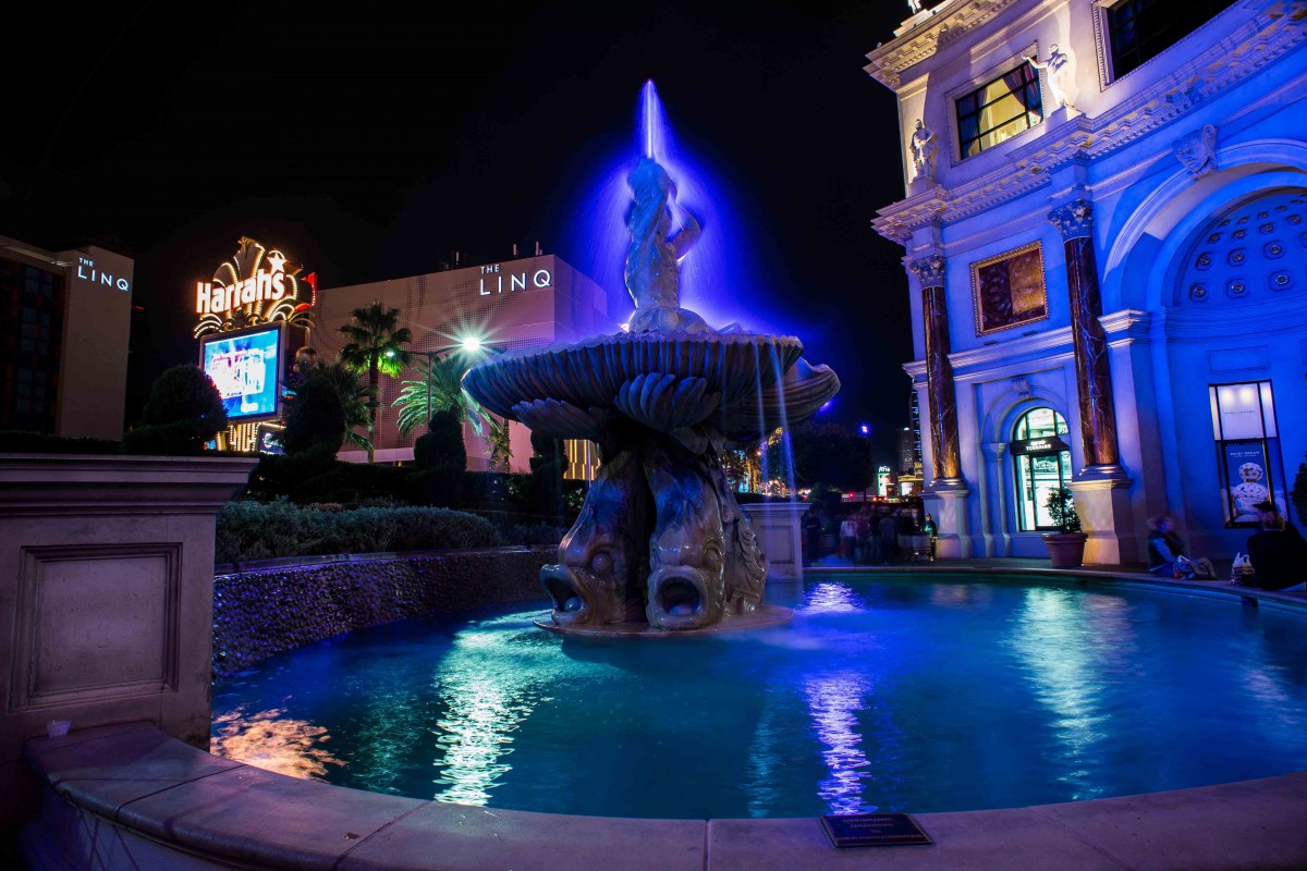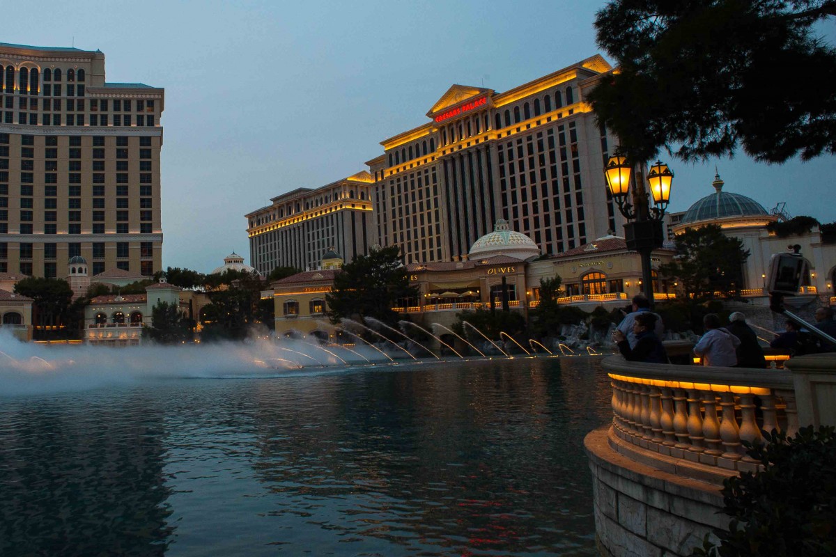 Leaving “Venice” and walking outside and across ”The Strip” you wander through the fountains and garden paths of Caesars Palace and its “Forum” . Massive concrete figures of Neptune, Pegasus and other Roman Gods loom large throughout the interior and exterior of this enormous structure. It is another hotel and shopping complex of monolithic proportions. All styled in the classic Roman era, it is a stone and sculpture triumph. It’s a visual dichotomy however, with 21st century electronic wizardry flashing all the while nestled inside a cavernous structure with larger than life size carved sculptures of Roman authority as if the ancient Colosseum gladiators and lions had momentarily been frozen in place and encased in stone. Water fountains of grand proportions abound, and the gardens surrounding it are exquisite. The football field sized gambling arena is constantly hosting a steady stream of hundreds of players flipping cards, rolling dice or feeding coins into slot machines. Figure hugging clad waitresses are ferrying drinks to punters who are completely fixated on the winking, blinking machines that occasionally reward their stares as they watch with anticipation the rolling, tumbling neon coloured electronic tiles in the hope that these will align and bring fortune and happiness.
